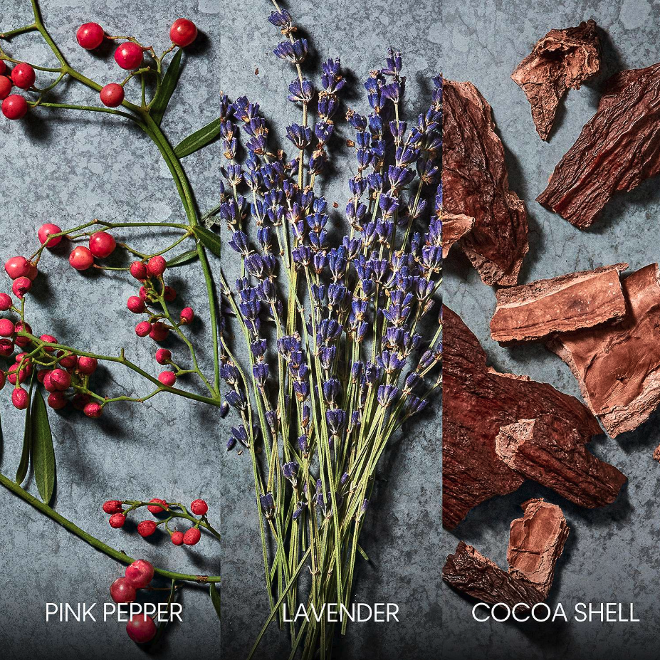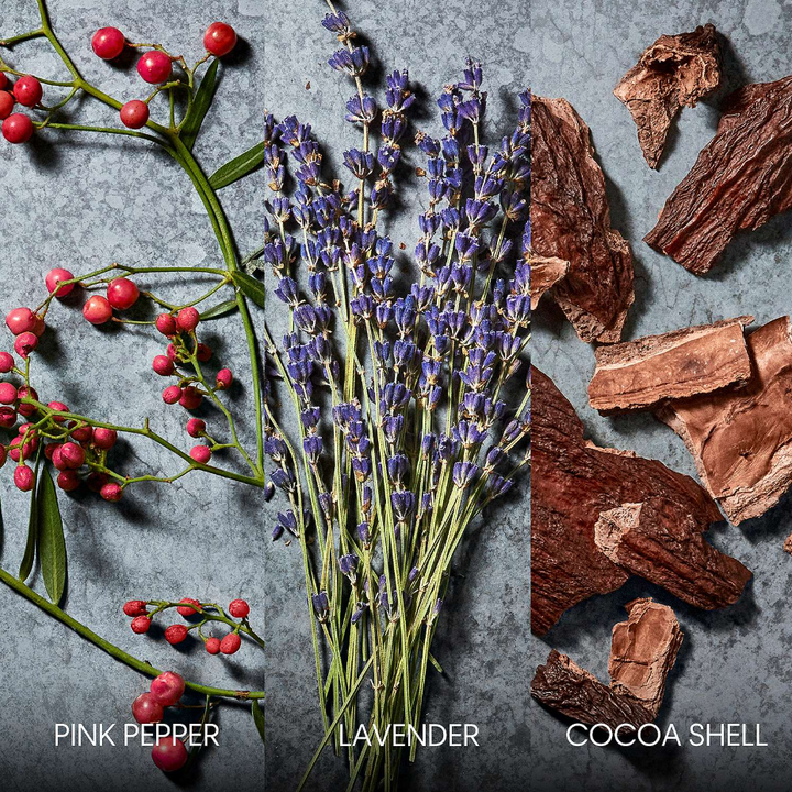 Key Notes: Mandarin Oil, Pink Pepper, Cardamom Oil, Lavender, Geranium, Fresh Ginger, Cocoa Shell, Vetiver, Sandalwood