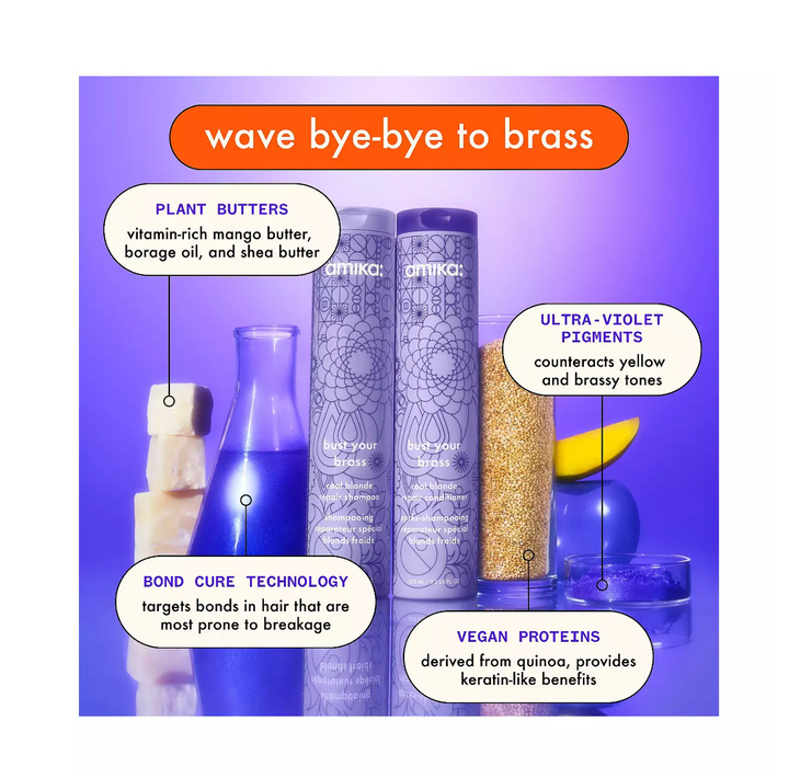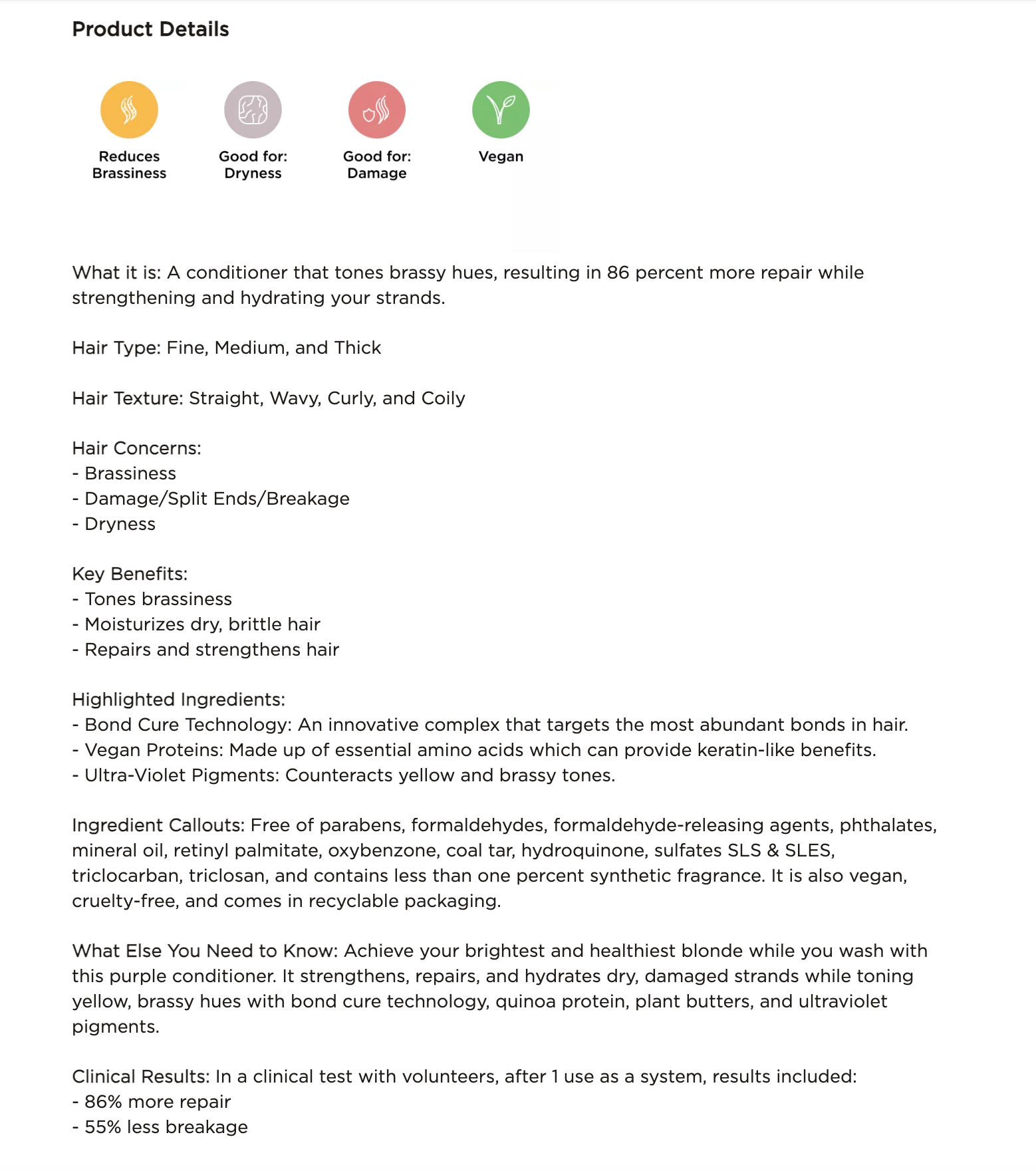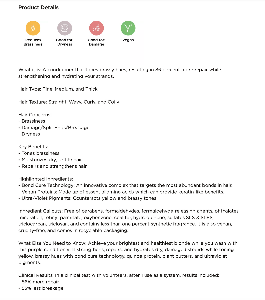 What Else You Need to Know: Achieve your brightest and healthiest blonde while you wash with this purple conditioner. It strengthens, repairs, and hydrates dry, damaged strands while toning yellow, brassy hues with bond cure technology, quinoa protein, plant butters, and ultraviolet pigments.
