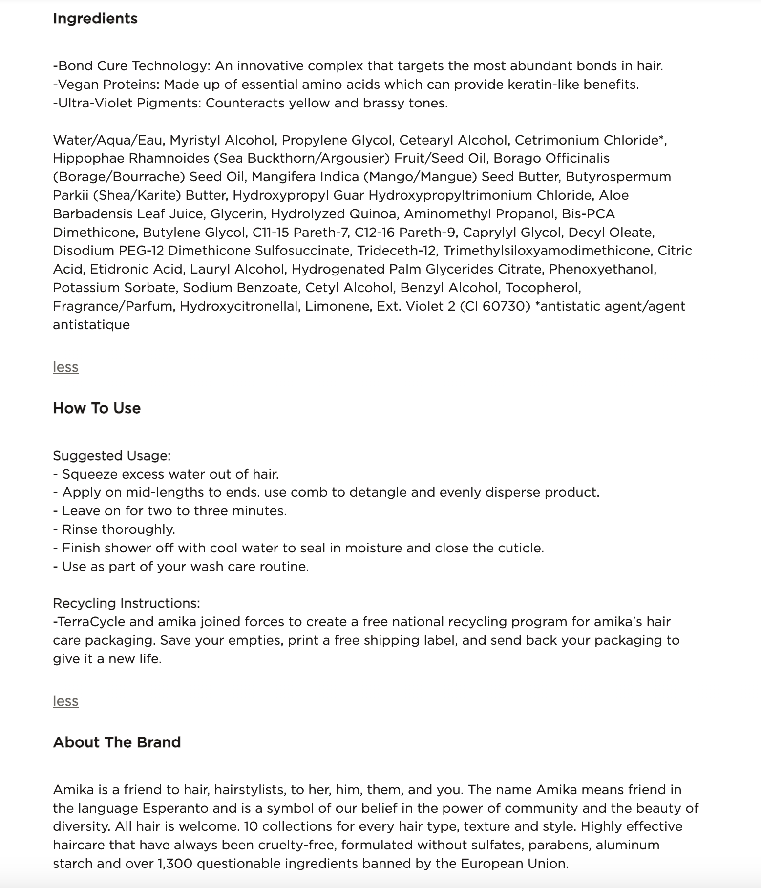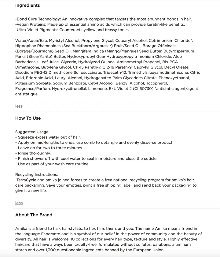 Amika is a friend to hair, hairstylists, to her, him, them, and you. The name Amika means friend in the language Esperanto and is a symbol of our belief in the power of community and the beauty of diversity. All hair is welcome. 10 collections for every hair type, texture and style. Highly effective haircare that have always been cruelty-free, formulated without sulfates, parabens, aluminum starch and over 1,300 questionable ingredients banned by the European Union.