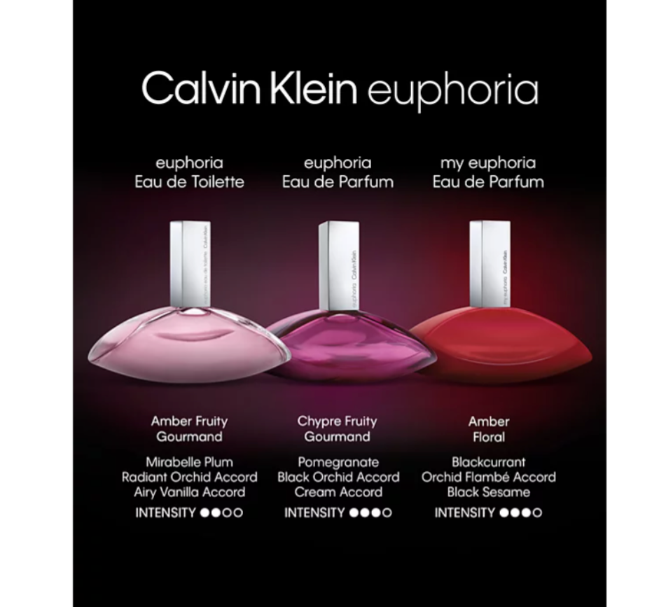 Euphoria is about sexiness, fantasy, and being captivating. Sexy and sensual, euphoria speaks to the woman who has the urge to break free from everyday life - to provocatively be part of an exciting world filled with pleasure, surprise, and temptation. Her fragrance is a contrast between exotic fruits and seductive florals, for a rich, creamy, seductive signature.