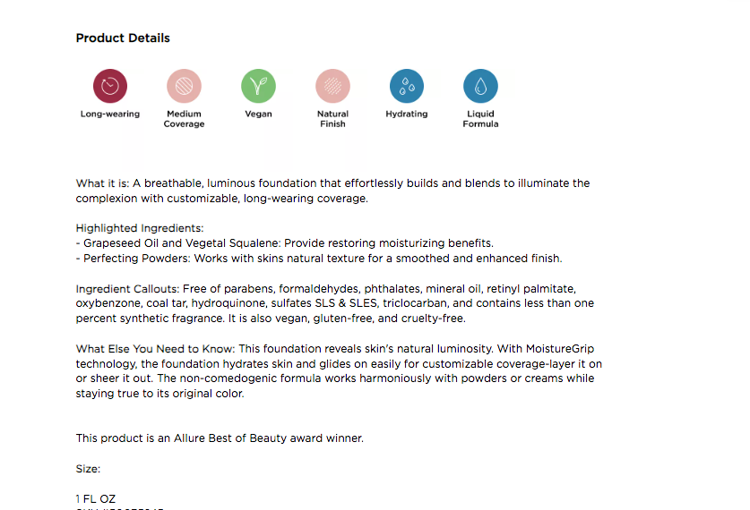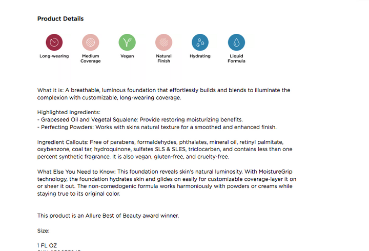 - MoistureGrip™ Technology: Contains vegan squalane and grapeseed oil to hydrate and deliver all-day wear.