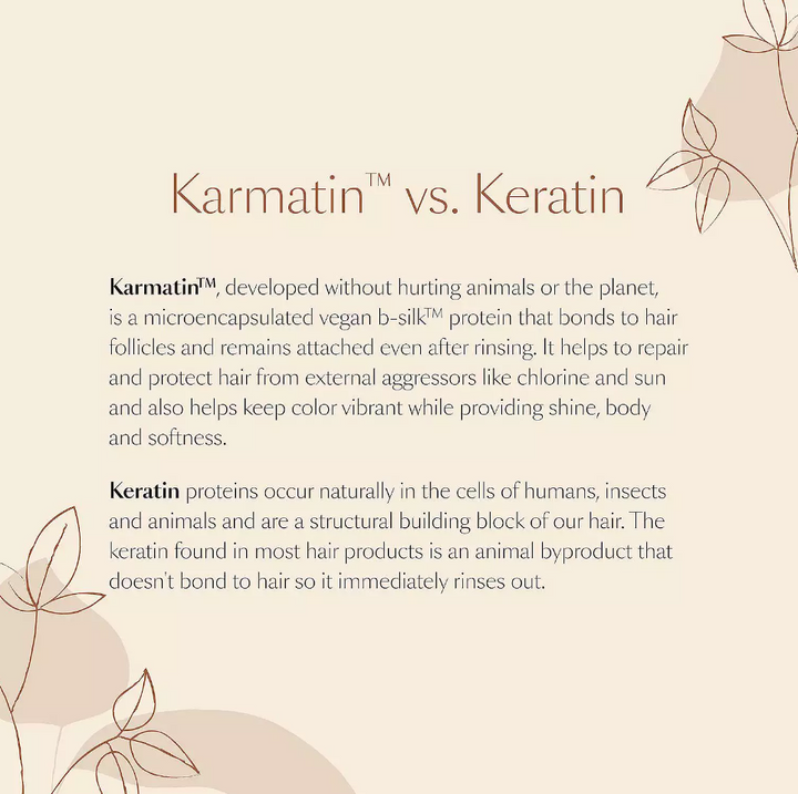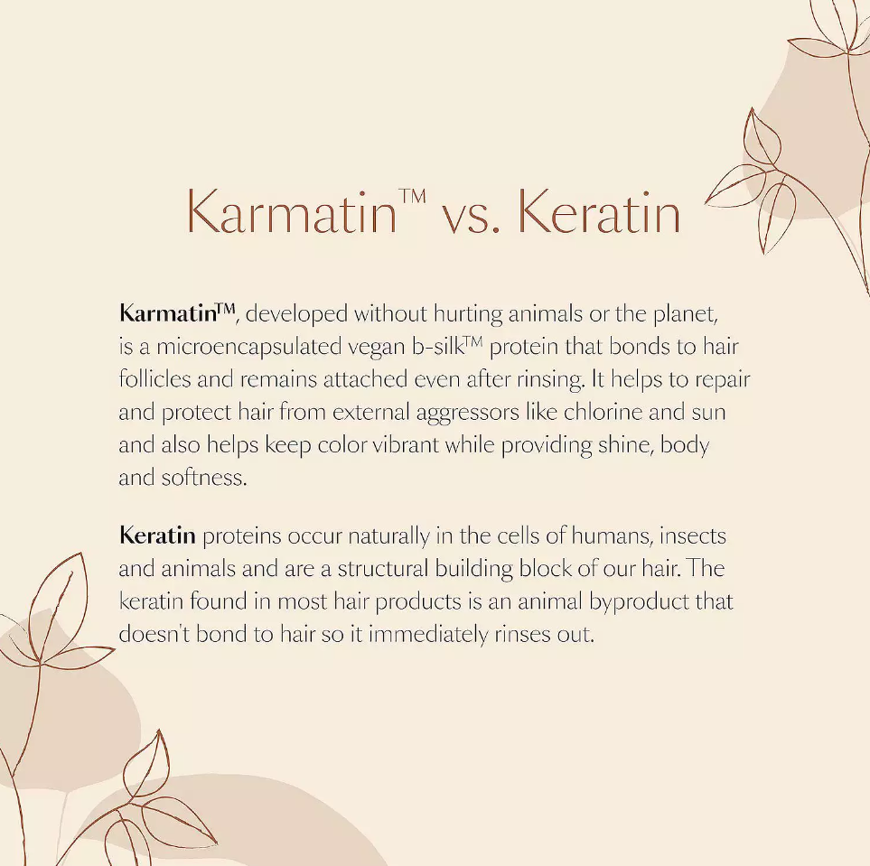 - Karmatin (vegan keratin from B-Silk): Forms a deeply moisturizing, vegan silk barrier that smoothes & shines